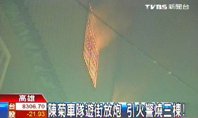 據(jù)報(bào)道,陳菊23日到高雄縣的永安、彌陀和梓官等鄉(xiāng)鎮(zhèn)車隊(duì)掃街拜票,傍晚17點(diǎn)多行經(jīng)梓官鄉(xiāng)光明路時(shí),支持者和車隊(duì)沿途放沖天炮,突然有民眾目擊,沖天炮飛竄到一家電子專賣店三樓的鐵皮屋,火勢(shì)并且迅速延燒到左右兩邊的民宅三樓,消防局17點(diǎn)20分接獲報(bào)案后,出動(dòng)7輛消防車前往搶救,17點(diǎn)58分控制火勢(shì),18點(diǎn)15分將火勢(shì)完全撲滅,幸好沒有民眾受傷,不過,三間民宅的三樓頂都已經(jīng)被燒毀,陳菊競(jìng)選總部事后表示,會(huì)協(xié)助修復(fù)。
