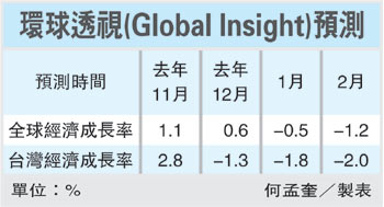 財(cái)經(jīng)官員指出,環(huán)球透視本來每季做預(yù)測,近來因經(jīng)濟(jì)情勢變化太大,改成月月發(fā)布,有關(guān)部門也盯著每月下修數(shù)字。