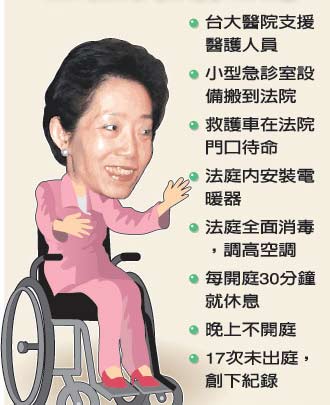 臺北地院這次更破天荒開庭30分鐘就讓吳淑珍休息一次,也就是開庭的第七法庭對面的第八法庭,將成為吳淑珍專屬醫(yī)療間,還擔心吳淑珍怕冷,出庭座位下還會放置暖爐。