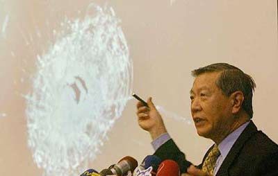 李昌鈺博士在離臺前的記者會上公布所采集的槍擊現(xiàn)場相關鑒識報告中指出:證據(jù)顯示陳水扁的傷口含有鉛微粒的成份及車窗的彈孔確實是從外向內(nèi)射擊造成的。
