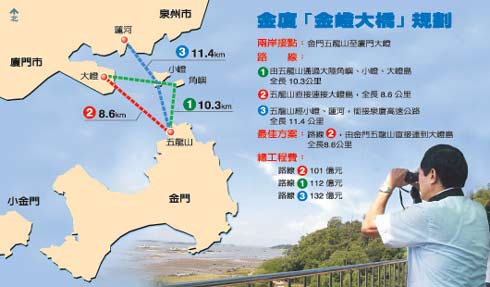 金門(mén)相關(guān)人士表示,一旦“金嶝大橋”興建完成,因?yàn)閺B門(mén)已重修完成大嶝島至翔安區(qū)的土堤,并正在興建翔安通往廈門(mén)本島的海底隧道。