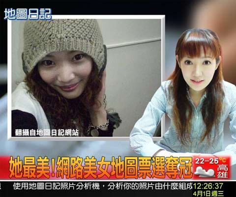 “想知道誰是臺灣最美的女性嗎?地圖日記網(wǎng)站日前舉辦美女票選,活動一個月就突破千萬的瀏覽率…”,玄藏大學(xué)大三生劉伊珊一周前上傳自拍照片,制成網(wǎng)絡(luò)美女票選奪冠的頭條新聞,沒想到還成功騙倒兩個同學(xué)。劉伊珊說,當(dāng)初只是想給同學(xué)一個驚喜,竟還有同學(xué)看到之后問,“你真的上電視喔?”