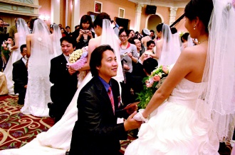 中新網4月16日電 據(jù)臺灣《聯(lián)合報》報道,花蓮縣15日在舉辦集體結婚,全縣100對新人完成終身大事,有日本郎娶臺灣美嬌娘,也有佛教醫(yī)院人員娶基督教醫(yī)院護士,新人在微微的細雨中走過許愿池,誓言情愛一生。