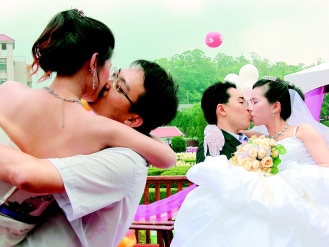婚禮結(jié)束后舉辦趣味比賽,新郎抱起新娘親吻比久,原先取前三名,結(jié)果十多對都通過“考驗(yàn)”,通通有獎,他們說:“她不重,她是我老婆!”