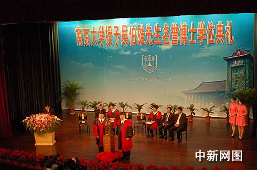 南京大學(xué)校長(zhǎng)、校學(xué)位評(píng)定委員會(huì)主任陳駿向吳伯雄頒發(fā)學(xué)位證書,并扶正流蘇。吳伯雄身著博士服,接受了學(xué)位證書。