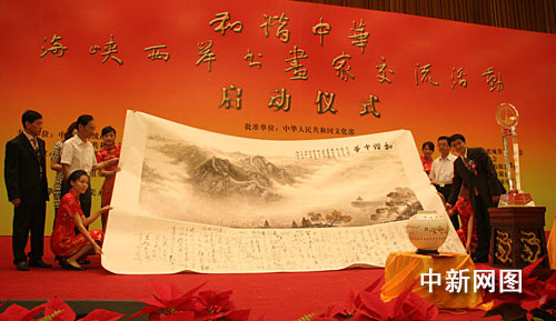 啟動儀式上展出了15幅丈八巨幅書畫作品,全部是著名書畫家的新近之作。由兩岸眾多書畫家聯(lián)袂創(chuàng)作的丈二國畫《和諧頌》,集中展示了當(dāng)代書畫界的最高藝術(shù)成就。此幅畫作將作為特殊禮品贈送給海峽交流基金會。