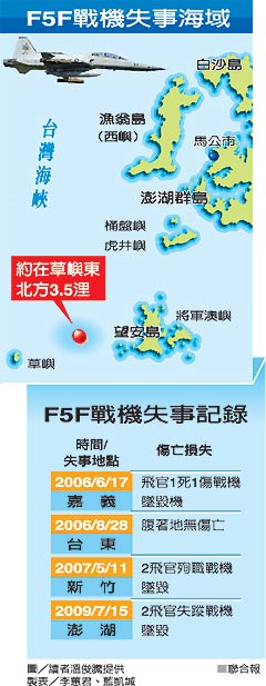 2009年7月15日編號(hào)5410的F-5F戰(zhàn)機(jī),在澎湖石礁靶場(chǎng)執(zhí)行空對(duì)地炸射訓(xùn)練失事,飛官黃挺瑜中尉和張良元中校失蹤。