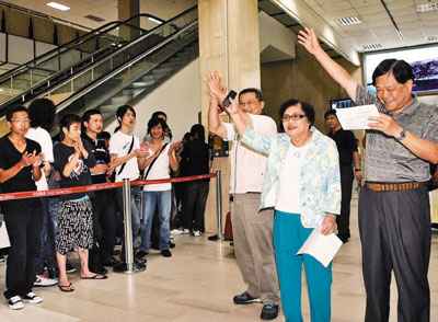 許榮淑踏進入境大廳,立刻有掌聲為她加油,三重市黨部動員許多民眾接機,可是仔細(xì)一看,這一整群的支持者還真有殺氣,穿著打扮不是黑就是白,即使在室內(nèi)也要戴墨鏡,就像在拍香港古惑仔的電影,身上的刺青格外引人注目,唯一跟港版古惑仔不同的是,臺灣的熱血男兒們嚼著檳榔。這些支持者不但搭4輛游覽車來相挺,還帶著打扮清涼火辣的辣妹一同觀摩政治人物如何造勢。