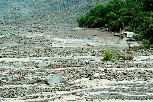 小林村幾乎難以辨認(rèn),一片爛泥石堆旁只有兩間民宅。村里民眾說,這兩間民宅本在村子地勢(shì)最高處,如今村子被土石流全吞掉,變成鄰近溪邊。房子被埋了,現(xiàn)地靜寂,全無人煙,救難人員無用武之地,雖然背著救援物資千辛萬苦趕來,卻沒救到人,短暫搜尋后撤回甲仙。