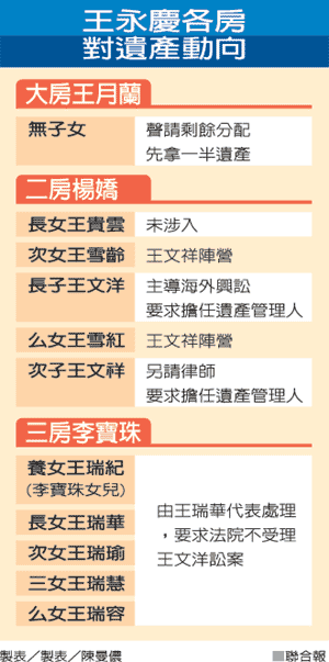 今年五月,王永慶長子王文洋瞞著家族,向美國新澤西法院跨海興訟,要求調(diào)查王永慶海外資產(chǎn),并申請擔(dān)任遺產(chǎn)管理人。這件臺灣史上金額最高的遺產(chǎn)官司昨天首次開庭,卻又爆出同為二房的王文祥、王雪紅等也要求取得遺產(chǎn)管理人資格,讓官司更復(fù)雜。