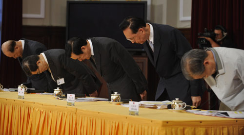 隨后,他帶領在場的蕭萬長、“行政院副院長”邱正雄、“國防部長”陳肇敏、“交通部長”毛治國等人起立,深深鞠躬道歉,足足有7秒鐘之久。