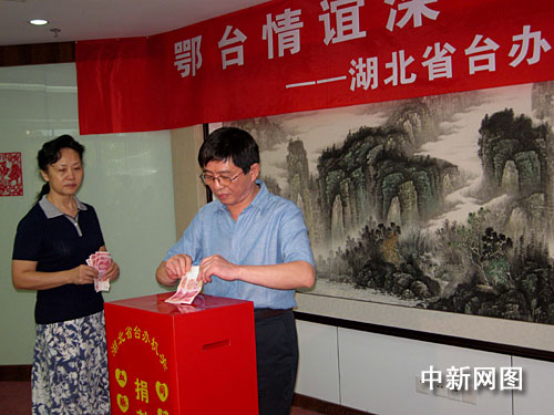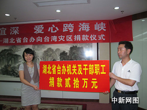 連日來(lái),不斷有湖北社會(huì)團(tuán)體、企業(yè)和民眾致電湖北省臺(tái)辦,表示要為災(zāi)區(qū)捐款、捐物。二十日下午,湖北省臺(tái)辦舉行捐款儀式,省臺(tái)辦機(jī)關(guān)捐出二十萬(wàn)元人民幣,省臺(tái)辦機(jī)關(guān)工作人員還現(xiàn)場(chǎng)捐款一點(diǎn)四萬(wàn)元。二十日,長(zhǎng)江三峽工程開(kāi)發(fā)總公司和武漢鋼鐵集團(tuán)公司通過(guò)臺(tái)辦系統(tǒng)和海協(xié)會(huì),分別向臺(tái)灣災(zāi)區(qū)捐款一千萬(wàn)元和五百萬(wàn)元。
