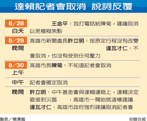 達賴記者會辦不辦成30日焦點,陳菊30日上午受訪時還堅稱記者會照舊,直到達賴方面表示取消后,才對外說“直赴災區(qū)原就是她的建議行程”,引起外界質(zhì)疑是高雄市府事后“自圓其說”。