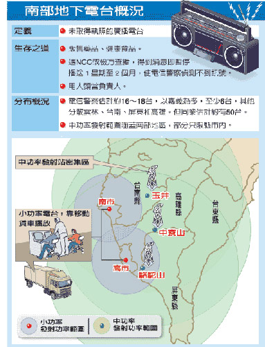 吳姓業(yè)者說,地下電臺發(fā)射塔多架設(shè)在高雄縣中寮山區(qū),這里有合法電臺發(fā)射塔,可利用合法掩護非法;其次高雄電信警察距中寮山約一個多小時車程,上山路況又不好,“執(zhí)法單位久久才會跑一趟”。