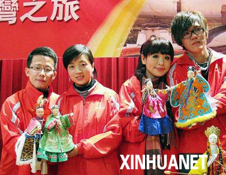 1月14日,兩岸新人在體驗臺灣布袋戲時合影留念。來自大陸的26對新人搭乘兩岸直航班機(jī)來到臺灣,將參加于1月15日在日月潭舉行的“日月同喜,喜傳天下”集體婚禮并游覽臺灣名勝古跡,感受當(dāng)?shù)仫L(fēng)土人情。新華社圖