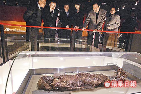 在媒體面前看展的馬英九稍有些心不在焉,看完樓蘭美女和棺木后,就打算從媒體前轉(zhuǎn)頭走人,漏掉旁邊“且末寶寶”的標(biāo)本,不過(guò)周美青顯然對(duì)且末寶寶有興趣,她停下腳步還拉了馬一把,把旁邊解說(shuō)板的說(shuō)明,念給馬聽(tīng),兩人又一同看個(gè)仔細(xì)。