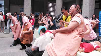 中新網(wǎng)3月4日電 據(jù)“中央社”報(bào)道,屏東縣4日舉辦婦女節(jié)系列活動(dòng)中的“超級(jí)媽媽闖關(guān)”活動(dòng),縣長(zhǎng)曹啟鴻(右)等扮孕婦,體驗(yàn)媽媽的辛勞。