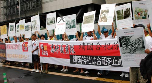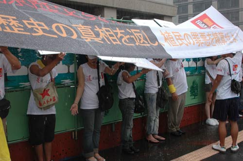 據(jù)臺灣《聯(lián)合報》報道,一行50多人于中午時分前往日本國會議事堂旁邊的參議員會館前,高舉控訴日本殖民時期迫害臺灣少數(shù)民族的巨大布條及歷史照片,高喊“拒絕參拜”、“還我祖靈”、“日本反省、謝罪和賠償”等口號,表達(dá)他們對日本的抗議。