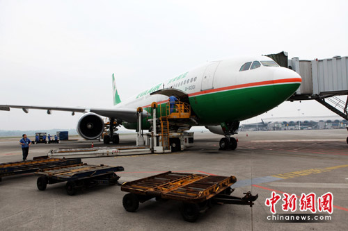 中新網重慶5月26日電 (記者 郭晉嘉)隨著富士康、英業(yè)達等臺企入駐重慶,今年以來渝臺直航航線客運持續(xù)火爆,貨運開始升溫。5月26日,臺灣立榮航空的B7192航班由麥道90機型改為252座的空客330機型執(zhí)飛,這是重慶—臺灣航線首次采用大型寬體機,也是首次大批運送貨物。