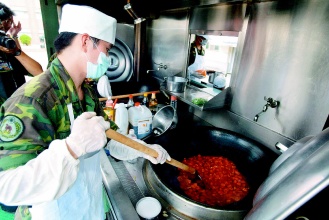 中新網(wǎng)8月4日電 據(jù)臺灣《聯(lián)合晚報》報道,臺當局“國防部”4日上午向媒體公開臺軍自行研發(fā)的野戰(zhàn)炊事車,每輛野戰(zhàn)炊事車配備四名食勤人員,在兩小時內(nèi)可以提供300位士兵熱食。這輛炊事車每輛造價400萬元,未來配發(fā)部隊后,當部隊野外演習時,可以有機會馬上吃到熱食,而不是后面送來的冷便當。