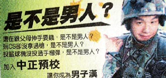 中新網(wǎng)4月8日電 據(jù)臺灣《聯(lián)合報》報道,只有男人才能念軍校?臺當(dāng)局“國防部”中正預(yù)校今年的招生廣告,斗大的標(biāo)題《是不是男人?》讓民代薛凌痛批軍方性別歧視,貶抑女性。