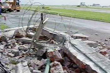 這輛拖掛車車頭撞得扭曲變形,還把圍墻撞下一大塊,更讓人緊張的是,它撞壞的是花蓮空軍基地的外墻,目前“漢光”演習(xí)正在進行,軍用飛機全讓外界看光。