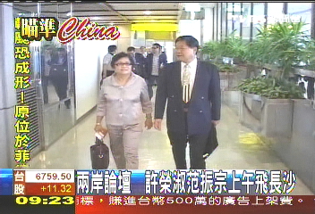 范振宗和許榮淑今天上午從桃園機(jī)場(chǎng)出發(fā),搭乘華航班機(jī)到長(zhǎng)沙,而國(guó)民黨代表團(tuán)11點(diǎn)鐘則從松山機(jī)場(chǎng)搭包機(jī)直飛長(zhǎng)沙,各自出發(fā)。