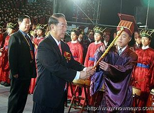 中新網(wǎng)9月27日電 2009年第二屆中華文化快車兩岸師生聯(lián)合祭孔大典今日上午在新竹隆重登場(chǎng),祭孔大典更開創(chuàng)先例,透過因特網(wǎng)同步同時(shí)在新竹、北京、山東三地聯(lián)合進(jìn)行,萬余名兩岸師生共同參與。親民黨主席宋楚瑜更第二度應(yīng)邀擔(dān)任祭孔大典正獻(xiàn)人,這也是近60年以來,臺(tái)灣民間祭孔規(guī)模最大的一次集會(huì)。