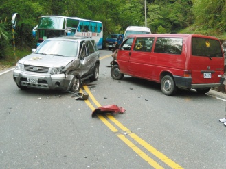 領(lǐng)隊邊雯雯和多名團員提說,車子開到下山右彎道時,對向車道突有輛休旅車想超過游覽車,開到他們的車道上,兩車都急忙轉(zhuǎn)向,他們搭的小巴車頭往左轉(zhuǎn)向,還是和休旅車的左側(cè)車頭擦撞;同團第二輛小巴煞車不及,追撞到第一輛小巴,造成第一輛小巴的8名游客,第二輛的2名游客受傷。
