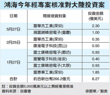 報道說,臺灣首富郭臺銘旗下的鴻海集團今年仍不斷投資大陸,由投審會項目審查核準的案子已有八件,累計金額8.27億美元,約新臺幣266億元。投審會執(zhí)行秘書范良棟指出,鴻海在大陸據(jù)點超過100個,增資資金來源來自盈余,大陸事業(yè)獲利后,一部分匯回臺灣,一部分再投資。