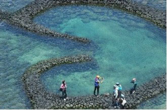 初見“雙心石滬”的游客,總以為這是自然地景,殊不知這精巧的石滬全出自當?shù)貪O民之手,能維持如此完美的造型,得靠漁民時時維護修補。就因為“雙心石滬”造型美得像藝術品,也成為七美島最著名的旅游景點,更期待能近距離接觸。