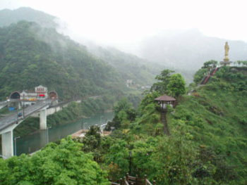 大約10分鐘,就爬上了觀音臺(tái)。觀音臺(tái)立有一座四十尺高,以青銅鑄造的觀音圣像,下方另一平臺(tái),有一圓頂?shù)牡钐,祀奉觀音神像。觀音臺(tái)上,居高臨下,眺望遠(yuǎn)近山水,俯瞰坪林聚落,景色怡人。觀音臺(tái)步道沿途亦無遮蔭,陰涼天氣或雨中來訪皆宜,惟不宜艷陽高照日。