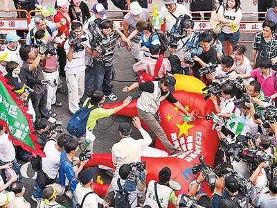 在臺北游行的一些綠營民眾因不滿馬英九與大陸簽署經(jīng)濟合作架構(gòu)協(xié)議(Economic Cooperation Framework Agreement,ECFA),準備了紅色巨型充氣馬玩偶,上面畫有我五星紅旗標志,還寫著“ECFA傾中賣臺”等文字,并煽動民眾踢踹泄憤。