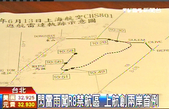 中新網(wǎng)6月16日電 據(jù)臺(tái)灣TVBS報(bào)道,兩岸直航以來(lái)發(fā)生第一次霸機(jī)事件,臺(tái)當(dāng)局民航部門拿出天氣惡劣的數(shù)據(jù)替FM801班機(jī)背書,不過(guò)但同一份數(shù)據(jù)卻掀開一個(gè)不能說(shuō)的秘密,該班機(jī)“抄快捷方式”返航上海,回程穿越敏感的“R8禁航區(qū)”,成為兩岸直航客機(jī)飛越軍事空管區(qū)首例。
