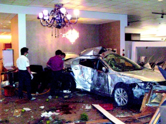 據(jù)臺(tái)灣《聯(lián)合報(bào)》報(bào)道,位于蘭陽(yáng)大橋南端的家具行前晚11時(shí)許還在營(yíng)業(yè),店員正帶客人看家具,突然聽(tīng)到“吱”一聲尖銳摩擦聲,接著“轟”的一聲,整臺(tái)銀色小轎車(chē)側(cè)撞進(jìn)來(lái),迎路整片落地玻璃撞碎,家具被撞飛,霹靂啪啦一片狼藉。