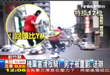 中新網(wǎng)7月23日電 據(jù)臺灣TVBS報道,新竹一名男子在車流量很高的市區(qū),騎車耍特技,把摩托車當(dāng)滑板,雙腳站在坐墊上,時速50公里前進,雖然才17秒鐘,但看起來險象環(huán)生。