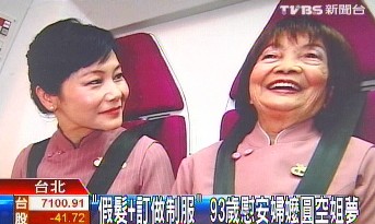 中新網(wǎng)7月29日電 據(jù)臺(tái)灣TVBS報(bào)道,臺(tái)灣最年長(zhǎng)慰安婦、93歲高齡的吳秀妹4年前積極投入慰安婦對(duì)日本求償?shù)目棺h活動(dòng)中,多次前往日本、韓國(guó)。吳秀妹愛(ài)上搭飛機(jī),尤其喜歡看空姐工作,臺(tái)灣婦援會(huì)知道吳秀妹很想當(dāng)空姐,尋求航空公司協(xié)助,終于一圓吳秀妹的空姐夢(mèng)。