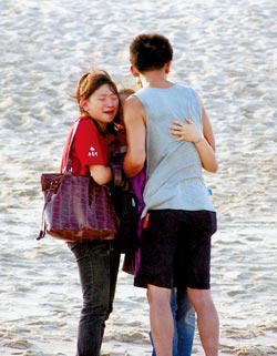 接獲惡耗的家屬相繼趕到后湖海灘,有人癱倒在親人懷抱中,不?藓皭(ài)子的名字,要他們趕快回來(lái),有的則手持念珠面向大海,盼望出現(xiàn)奇跡,天下父母心的焦灼憂(yōu)慮,讓蜂擁關(guān)切的民眾看了也心酸。