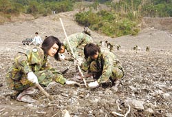 新開部落迄今仍有二十五位罹難者被掩埋在三層樓高的土石堆,前天臺軍在韓籍救難隊員指導下,趴在土石堆上,試圖循著臭味發(fā)現遺體。