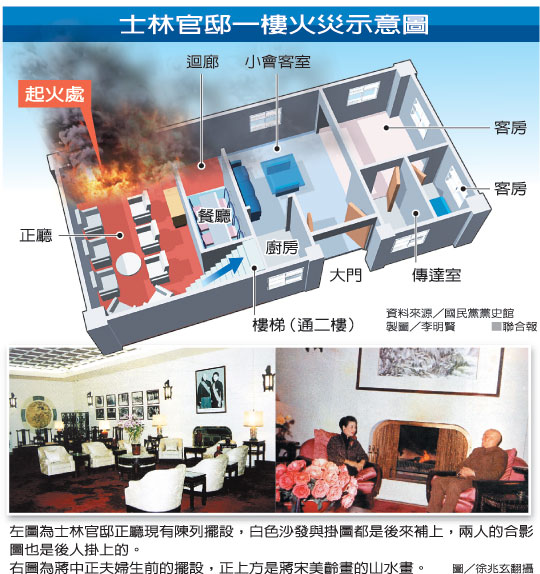 士林官邸包括開(kāi)放的花園及蔣介石及夫人宋美齡的正房住所,正房是兩層樓水泥建筑,一樓是大會(huì)客室,二樓是蔣、宋起居處。前夜起火點(diǎn)在一樓右側(cè)的回廊,火苗冒出時(shí)觸動(dòng)保全警報(bào)系統(tǒng)。