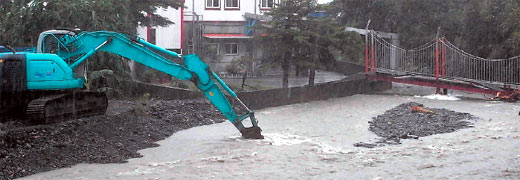 災(zāi)情最嚴(yán)重的是冬山鄉(xiāng)的太和村,上游的十三份溪在上次芭瑪臺(tái)風(fēng)來(lái)襲時(shí),溪里大量土石淤積,還來(lái)不及全部清除,這次又逢大雨,溪水暴漲淹到路面,多條農(nóng)路封閉?h府工務(wù)處緊急出動(dòng)3臺(tái)挖土機(jī)疏浚十三份溪,避免溪水的水位持續(xù)升高,造成更嚴(yán)重的災(zāi)情。