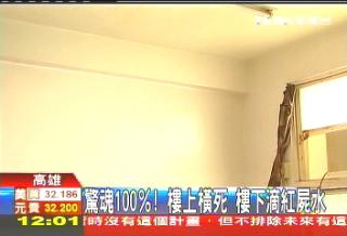 據(jù)臺(tái)灣TVBS電視臺(tái)報(bào)道,高雄縣一名女子這幾天發(fā)現(xiàn)墻角天花板流出暗紅色、有臭味的水。報(bào)警后,警方到公寓3樓開(kāi)門(mén),才發(fā)現(xiàn)在房間里有一具發(fā)黑浮腫的男尸倒臥床上,尸水滲出棉被流到地板再滲進(jìn)樓下房間,驚悚情景猶如恐怖電影情節(jié)。