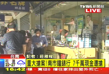 中新網(wǎng)11月23日電 據(jù)臺(tái)灣TVBS報(bào)道,臺(tái)南市一家鐘表行老板,23日下午到銀行提領(lǐng)新臺(tái)幣7000萬(wàn)元現(xiàn)金,準(zhǔn)備買黃金用,沒想到回家途中遭歹徒尾隨,回到店內(nèi)時(shí)歹徒開槍搶走現(xiàn)金,流彈還意外波及在店內(nèi)的老板侄女,侄女小腿中彈,送往成大醫(yī)院急救,歹徒則逃逸無(wú)蹤。