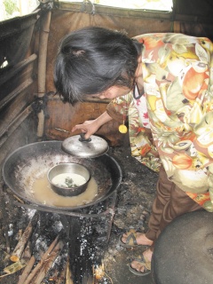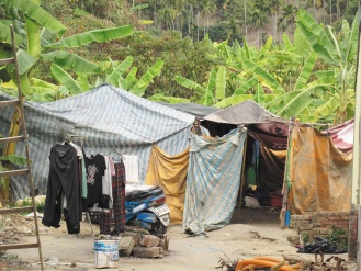 簡陋破落帳篷搭在香蕉園里,卓姓夫妻與兒子擠在不到兩坪的空間里;室內(nèi)堆放著臟亂衣物等用品,睡覺的地方用木板稍隔開,陳設(shè)比起工寮還要簡陋。緊鄰廚房僅有一只燒柴鍋?zhàn),卓家女主人鍋(zhàn)诱谡舻,蒸蛋的水暗沉,她說:“這是早餐。”