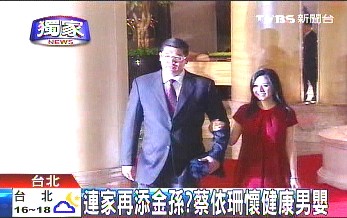 中新網(wǎng)2月1日電 據(jù)臺灣TVBS報道,連戰(zhàn)最快可能在今年7月就會抱到第2個金孫。據(jù)了解,連戰(zhàn)兒媳婦蔡依珊已懷孕4個月,嬰兒超音波初步顯示,胎兒是一名健康的男嬰,預產(chǎn)期在今年7月,極有可能生下一名“獅子寶寶”。