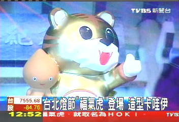 中新網(wǎng)2月1日電 據(jù)臺灣TVBS報道,2010年臺北燈節(jié)主燈座1日亮相,一座長相渾圓可愛的福氣虎,取名為“Hoki”(閩南語:福氣),這只福氣虎有20米高,旁邊還圍繞著5位花精靈,整個組合不僅色彩十分豐富,還會搭配雷射光和水舞秀,甚至還會釋放花香,讓民眾在賞燈時,有豐富的感官享受。