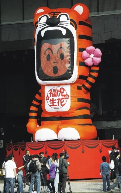 即日起,民眾經(jīng)過市府前,將會看到2只可愛又招福氣的“開心;ⅰ。一只趴在市府大門樓上,一只在市府大門口,手上都拿著花朵,造型相當卡哇伊,宛如守護神般陪伴民眾度過虎虎生威的新年。;⒃O(shè)計者李明道表示,市府大門口的開心福虎高9.5公尺、底座寬6.3公尺,手拿美麗花朵意味今年底“花博會”將在臺北登場,開心福虎的臉部裝有LED熒幕。