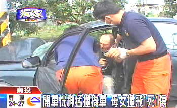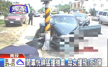 中新網(wǎng)3月4日電 據(jù)臺灣TVBS報道,南投縣草屯今天發(fā)生一起死亡車禍,轎車駕駛疑似恍神,直接撞上騎摩托車雙載的母女,車被撞飛了10米遠,坐在后座的媽媽雖然有戴安全帽,但因為摔下車時,被轎車撞上頭部,當場傷重不治。