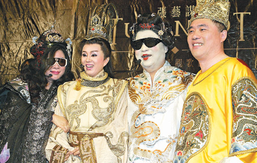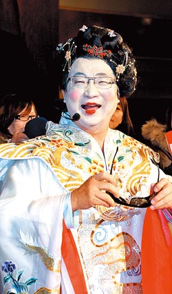 胡志強(qiáng)犧牲“色相”,涂上脂粉、抹成櫻桃小嘴,身著華麗戲服,花一個(gè)多小時(shí)化妝,才順利變成反串成主角圖蘭朵公主,現(xiàn)場卻有人說“不像公主,比較像藝妓”。郝龍斌則是黃袍加身,扮成皇帝,成了圖蘭朵的父親。陳文茜身著戲服、戴著墨鏡,飾演圖蘭朵的妹妹。孫翠鳳則扮成王子卡拉富,四人妙語如珠,引起哄堂大笑。