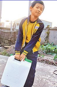 過去爸爸住院期間,洪銘楠幾乎每天搭車到醫(yī)院照顧爸爸,父親去世后,因祖母患有嚴重的糖尿病,無法提重物,他也從兩年前開始每天到加水站扛飲用水回家,不過四十多公斤的孩子,雙手提著裝滿二十公斤水的塑料桶,一步一步慢慢走回家,水的重量幾乎是他體重的一半。